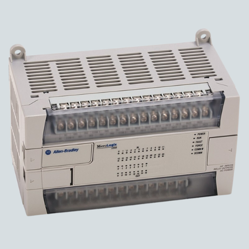 MicroLogix 1200 with 120/240VAC power, featuring 20 standard 24VDC digital inputs and 4 fast 24VDC digital inputs. It includes 16 relay outputs and a Programming/HMI port.