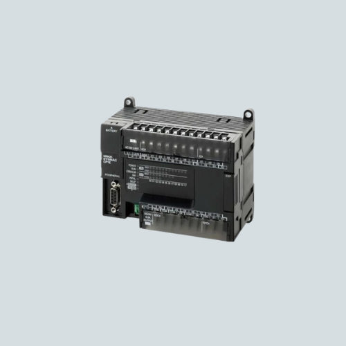A Programmable Logic Controller (PLC) with a power supply range of 100-240 VAC. It features 24 inputs designed for 24 VDC operation, 16 relay outputs capable of handling 2 A each, a program memory with a capacity of 8,000 steps, and a data memory of 8,000 words. Additionally, it is equipped with RS-232C and RS-485 (half-duplex) ports for communication.