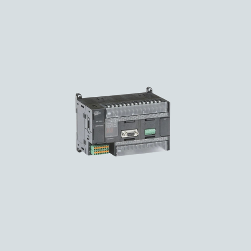A Programmable Logic Controller (PLC) with a power supply ranging from 100 to 240 VAC. It features 24 inputs at 24 VDC, 16 relay outputs with a capacity of 2 A, 4 analog inputs, 2 analog outputs, and a program capacity of 20,000 steps with a data memory of 32,000 words.