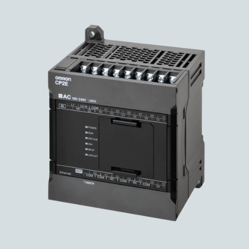 CP2E series compact PLC belonging to the Network type, equipped with 12 digital inputs (DI) and 8 digital outputs (DO) featuring NPN output configuration. The power supply operates at 24 VDC, and the PLC has a program memory capacity of 10 kSteps.