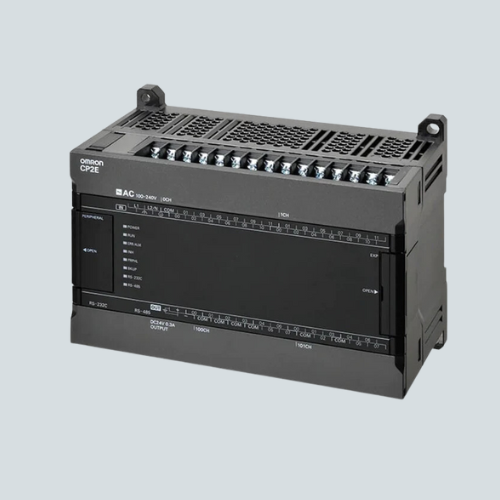 CP2E series compact PLC, belonging to the Standard Type category, featuring 24 digital inputs (DI) and 16 digital outputs (DO) with relay output configuration. The power supply operates at 220 VAC, and the PLC is equipped with a program memory capacity of 8 kSteps.