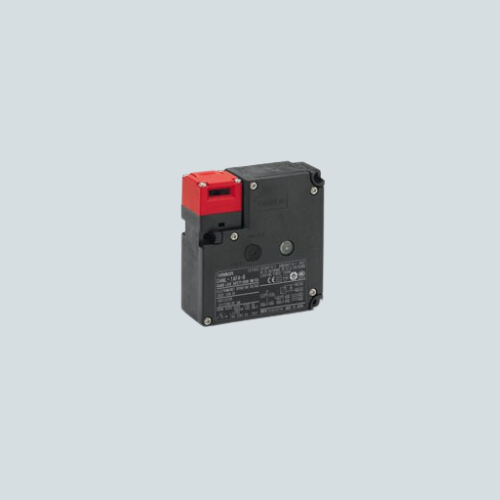 A guard lock safety-door switch with the model D4NL, designed for M20 mounting. It features 1 normally closed (NC) and 1 normally open (NO) contact with slow-action, a plastic head, and a mechanical lock with a 24-VDC solenoid release. The LED indicator operates within a voltage range of 10 to 115 VAC/VDC.