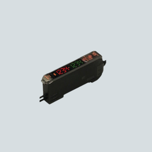 A photoelectric sensor designed as an optical fiber amplifier with Master/Slave capabilities. It operates on DC power, has a 3-wire configuration with a PNP output, features teach functionality, and includes twin digital displays. It's worth noting that a separate connector is required for its operation.