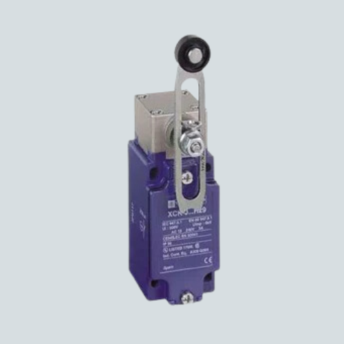 Limit switch XCKJ with a thermoplastic roller lever of variable length. It includes 1 normally closed (NC) and 1 normally open (NO) contact, operates with a snap action, and has a Pg13 thread.