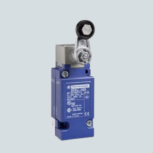 XCKJ limit switch with a steel roller lever, featuring 1 changeover contact (1C/O), snap action, and an M20 connector.