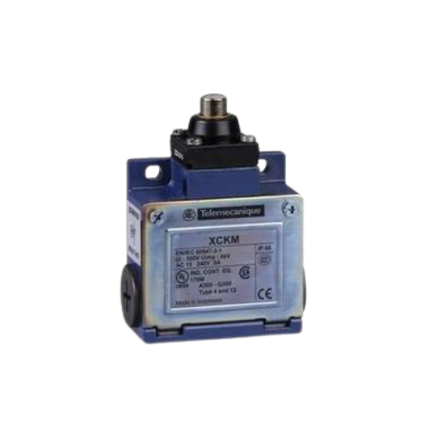 XCKM limit switch with metal end plunger, featuring 1 normally closed (NC) and 1 normally open (NO) contact. It operates with snap action and is designed with a Pg11 thread size.