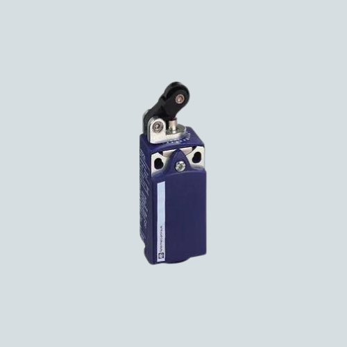 XCKP limit switch with thermoplastic roller lever (plunging horizontally), 1NC+1NO contacts, snap action, M16 mounting.