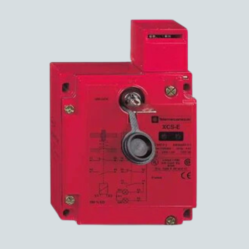 XCSE metal safety switch with 3 normally closed contacts, slow-break function, and 2 entries tapped at Pg 13, suitable for 24V operation.