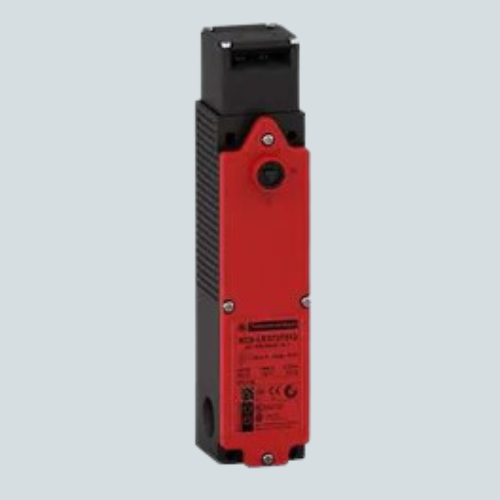 XCSLE plastic safety switch with 4 normally closed (4NC) and 2 normally open (2NO) contacts, slow-break action, and 3 tapped M20 entries, suitable for 24V operation.