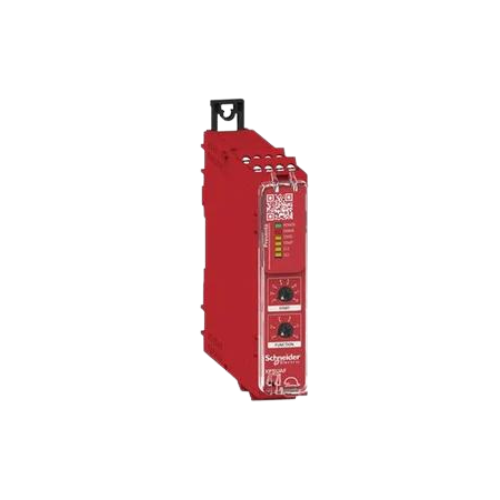 Preventa module with Category 4 safety features, offering potential-free normally closed (NC) and normally open (NO) contacts, as well as PNP/PNP configuration, suitable for 24V AC/DC applications and featuring screw terminals.