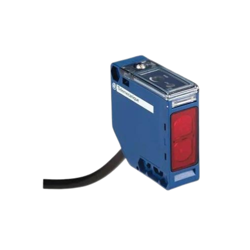 XUK photoelectric sensor with diffuse sensing, 1m detection range, and compatibility with 24 to 240VAC/DC power supply, featuring a 2-meter cable.